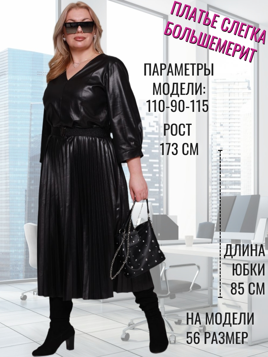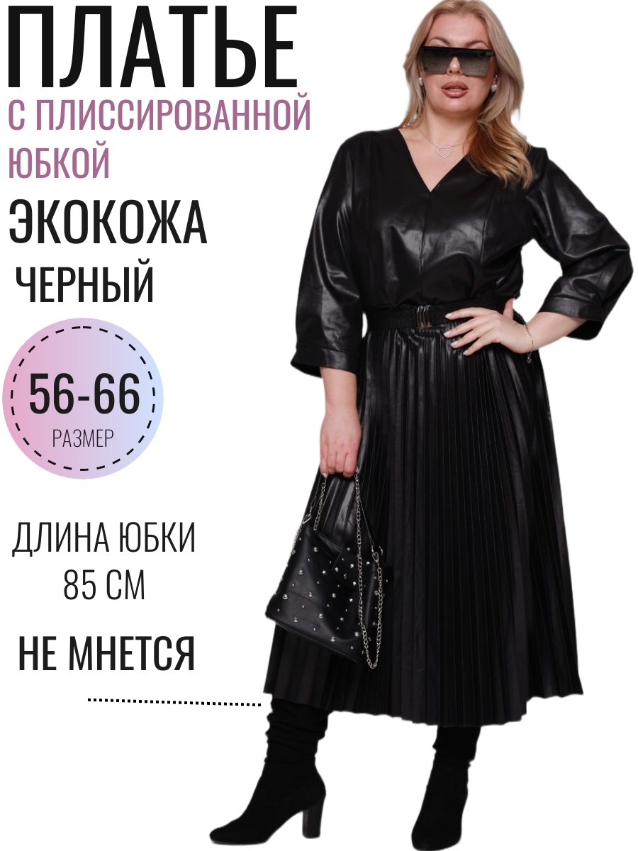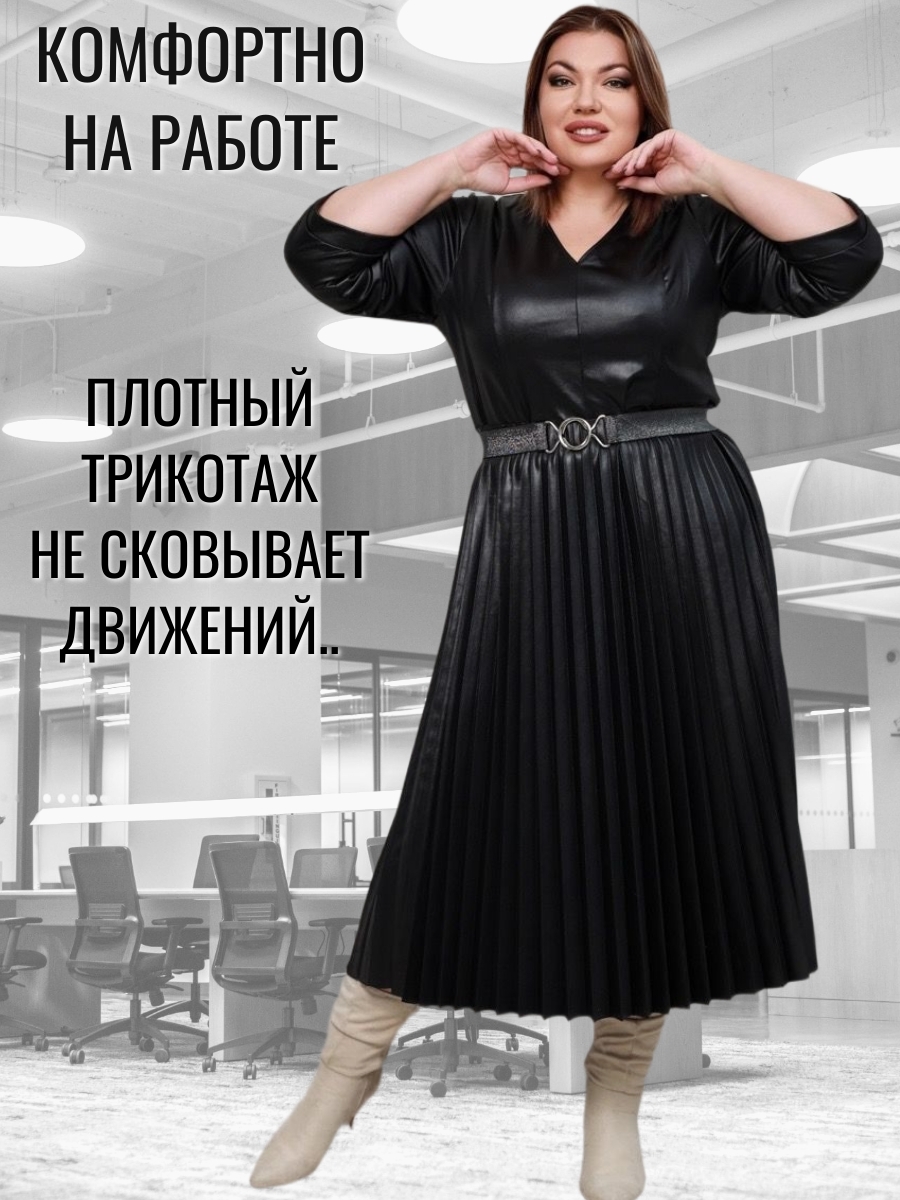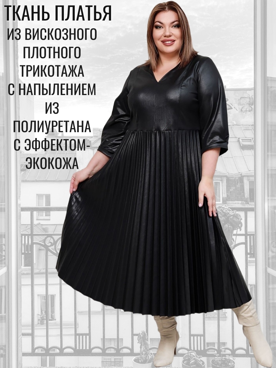 Бренд Царицын дом представляет платье из эко-кожи с плиссированной юбкой и поясом на оригинальной пряжке для пышных девушек. Хлопковая ткань с эластаном с напылением полиуретанового слоя экокожи комфортна в носке и не липнет к телу. Платье слегка большемерит, если Вы хотите , чтобы платье сидело в обтяжку- берите на размер меньше. Юбка длиной 85 см , пояс из декоративной резинки с люрексом, садится по талии. Прекрасное решение для офиса или официального мероприятия. Стирка в бережном режиме, сушить вертикально на плечиках, гладить с изнанки .