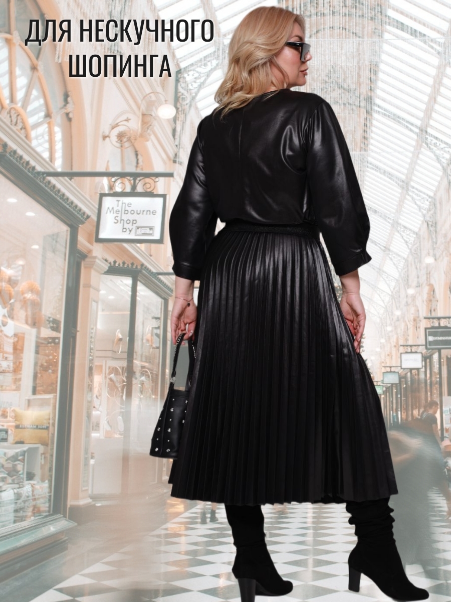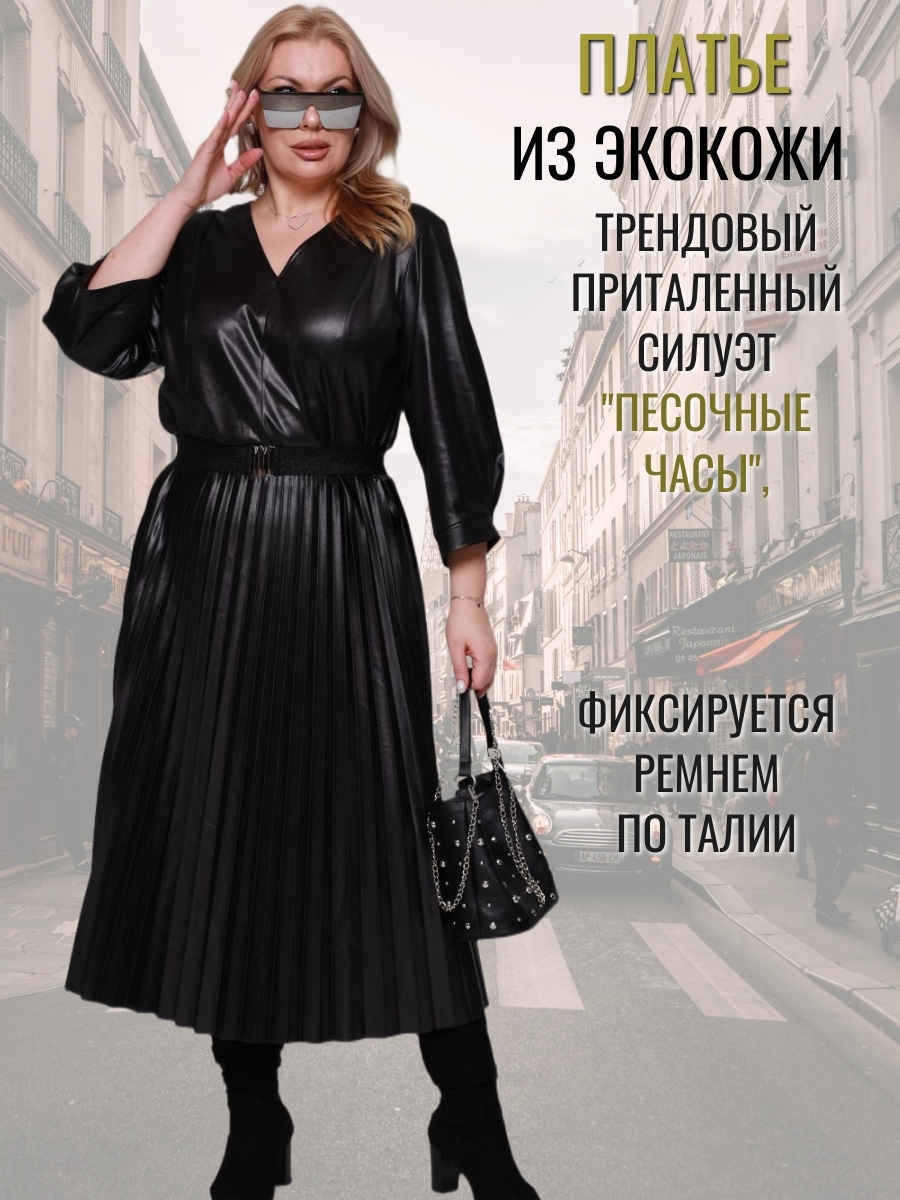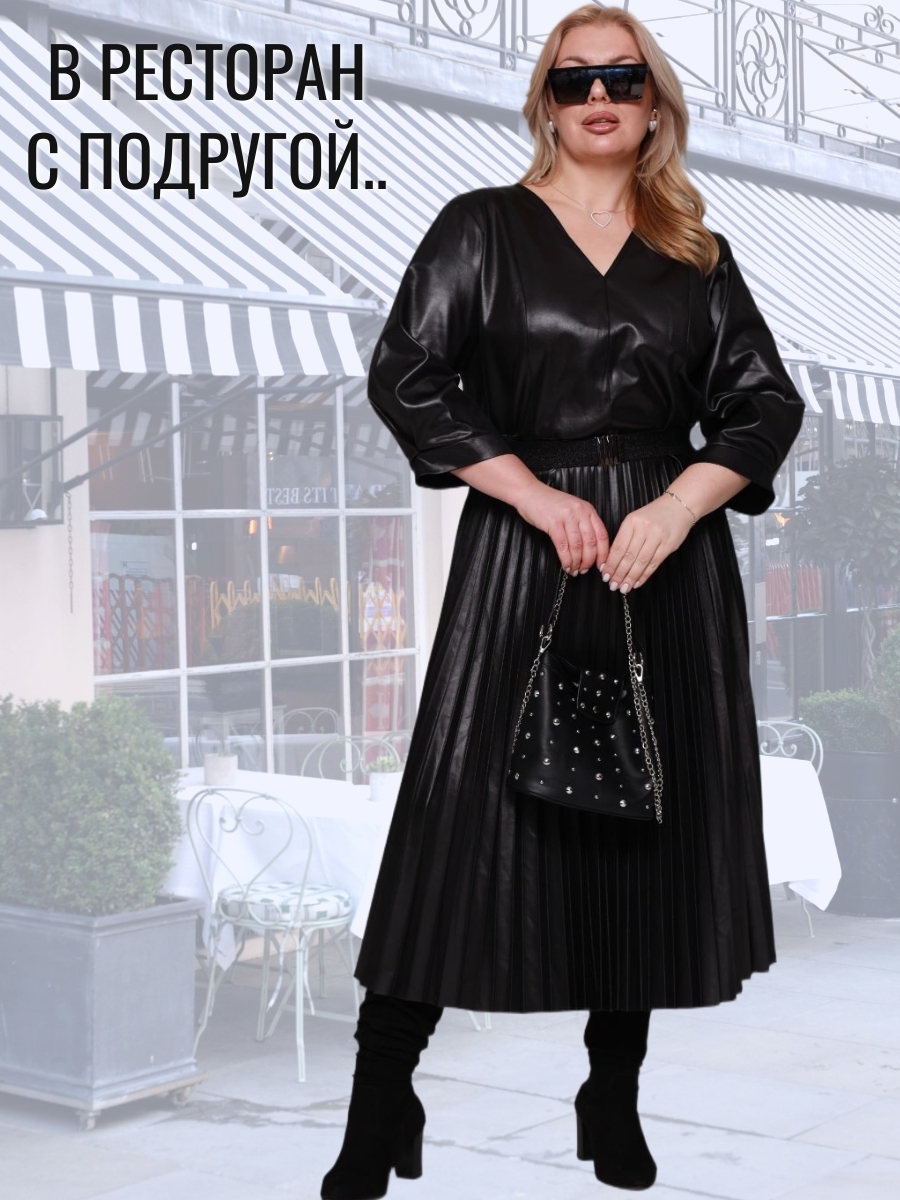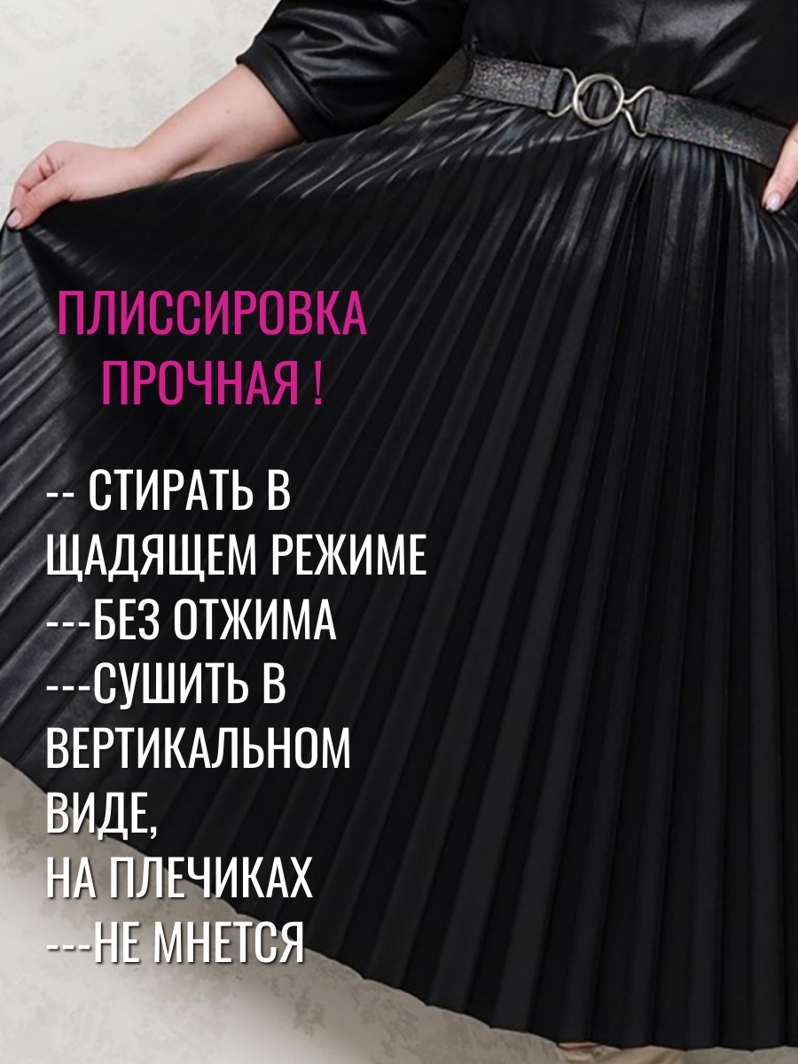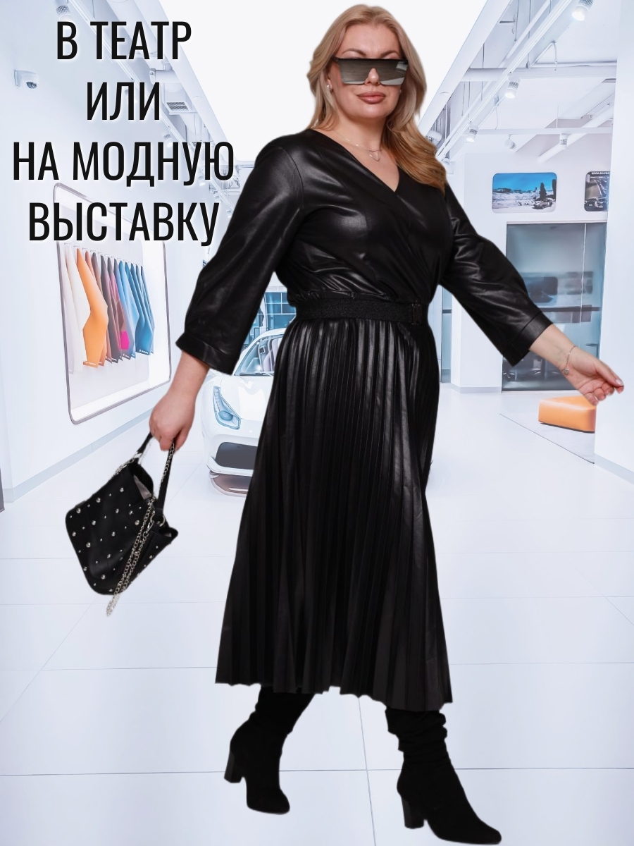 Бренд Царицын дом представляет платье из эко-кожи с плиссированной юбкой и поясом на оригинальной пряжке для пышных девушек. Хлопковая ткань с эластаном с напылением полиуретанового слоя экокожи комфортна в носке и не липнет к телу. Платье слегка большемерит, если Вы хотите , чтобы платье сидело в обтяжку- берите на размер меньше. Юбка длиной 85 см , пояс из декоративной резинки с люрексом, садится по талии. Прекрасное решение для офиса или официального мероприятия. Стирка в бережном режиме, сушить вертикально на плечиках, гладить с изнанки .