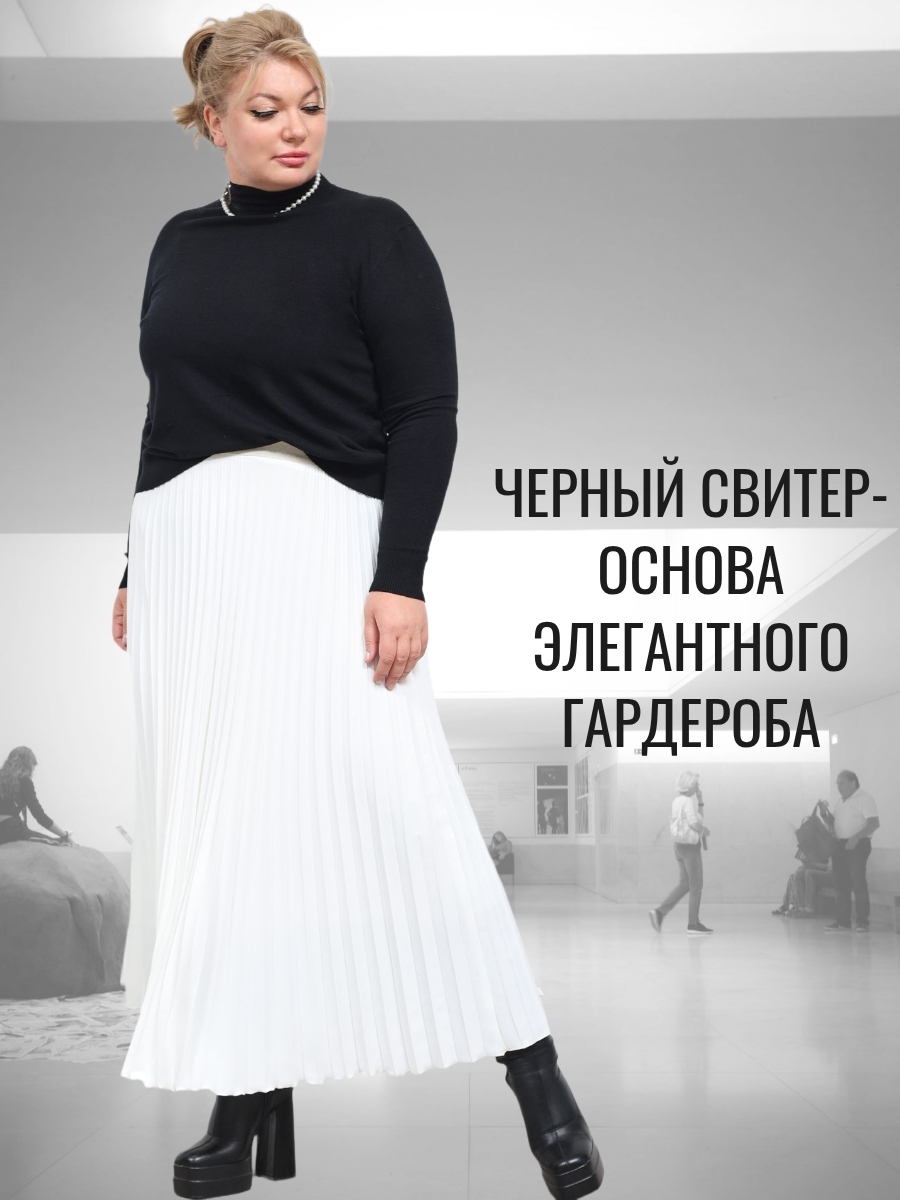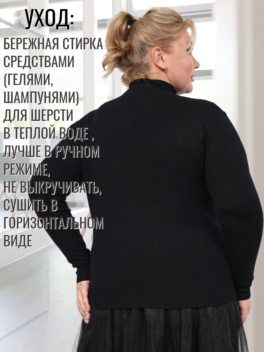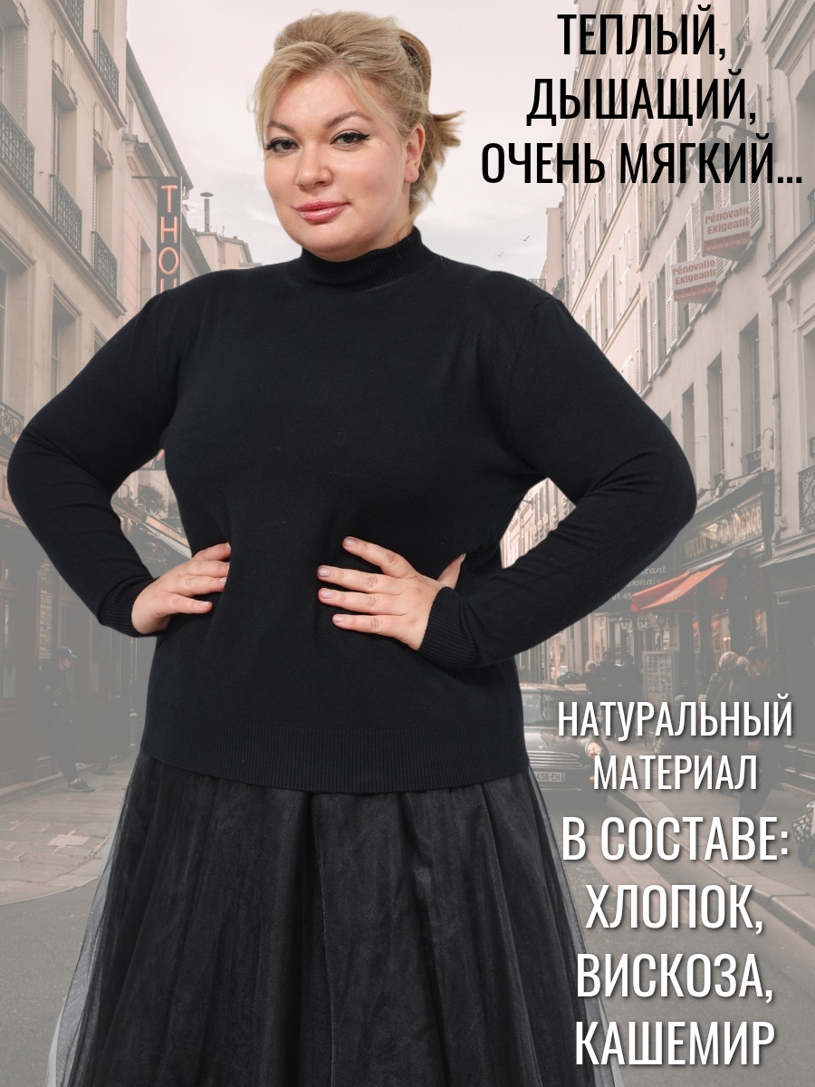 Необычайно комфортный свитер с модным и актуальным в этом сезоне высоким воротником. Благодаря особому плетению, вы сможете носить его как свободный оверсайз, если ваш размер 50-52, или облегающий, если ваш размер 56-58, как наша модель на фото. Этот базовый свитер осени 2024 станет идеальным дополнением к вашему стильному образу.
